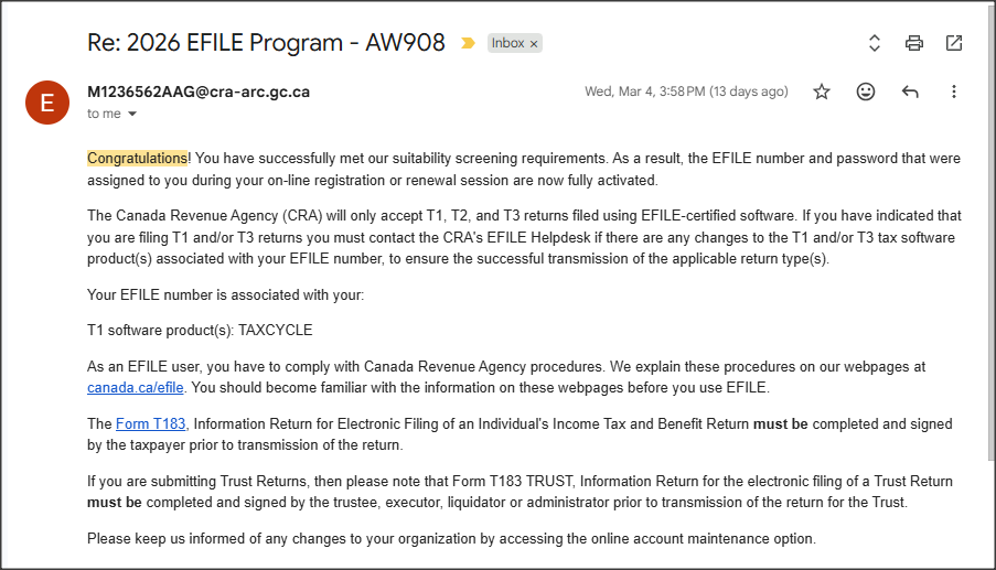 We e-file to the CRA. Most refunds arrive within 8 business days via direct deposit.